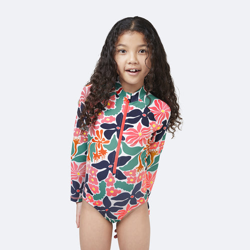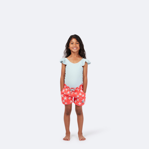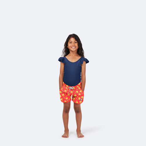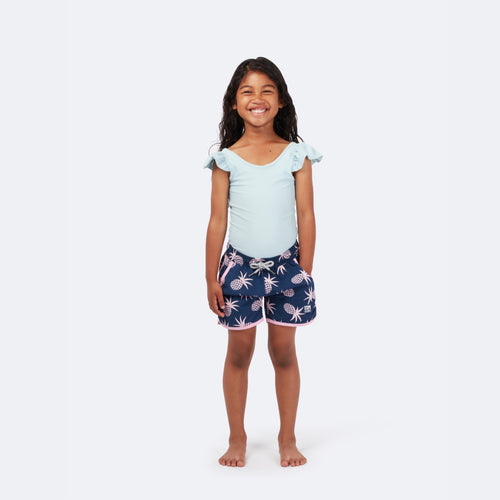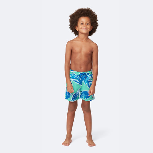 Our tropical banana-leaf print board shorts will add a fresh, fun twist to your best girl’s beach kit. Featuring a bold blue leaf design on a vibrant green background, these sporty shorts are crafted from super-soft, UV50+ recycled-blend fabric for all-day comfort and sun protection. The lightweight, quick-dry material and flexible fit make them perfect for running, splashing, and every adventure in between. Pair them with a navy or white one-piece for an effortlessly cool swim look.