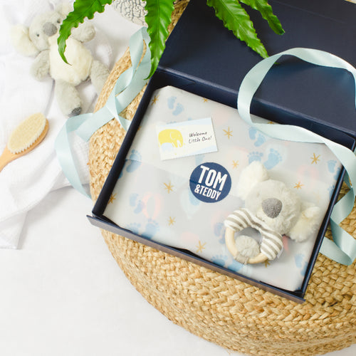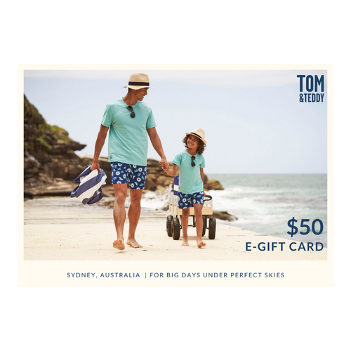 We’ve got the perfect new-baby gift… pick out your favourite matching adult and baby-size Tom & Teddy swimmers and we’ll wrap them up beautifully in tiny-feet printed tissue paper and a baby-shower gift box.